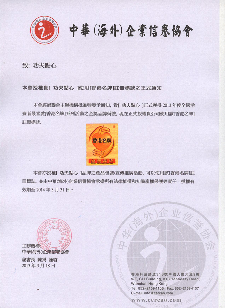 功夫點心榮獲「香港名牌」金獎品牌 2013