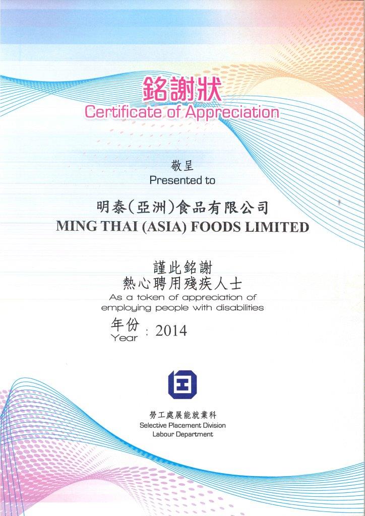 明泰(亞洲)食品有限公司榮獲「熱心聘用殘疾人士」感謝狀