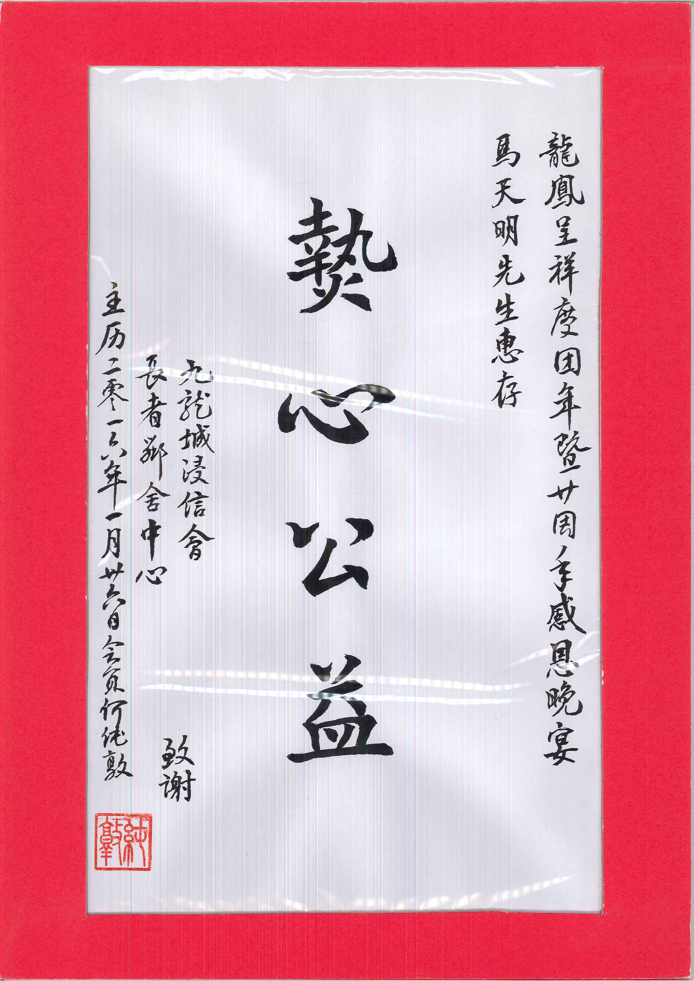 九龍城浸信會20週年感恩晚宴頒發感謝狀