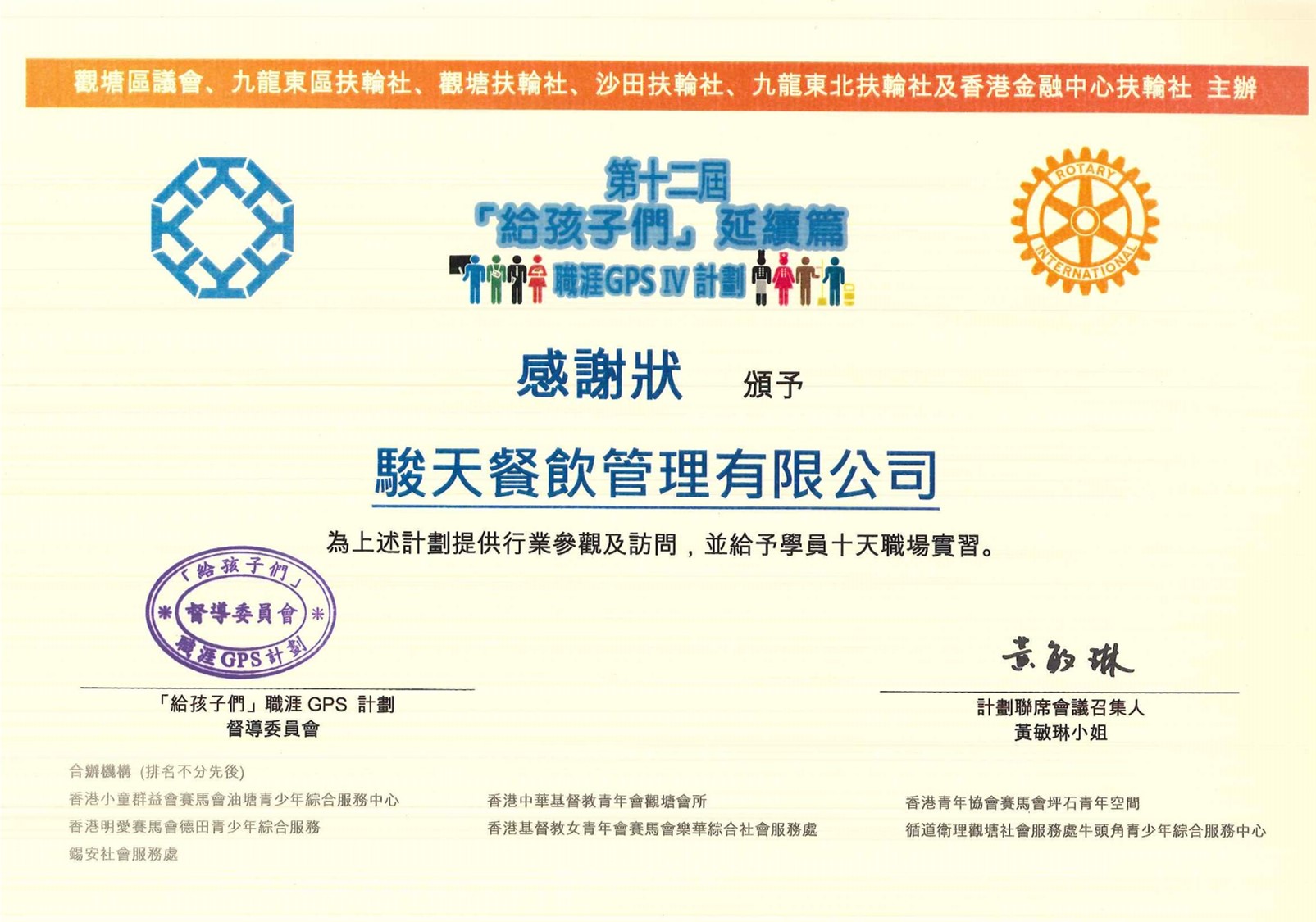 駿天餐飲管理有限公司獲頒「熱心聘用殘疾人士」銘謝狀